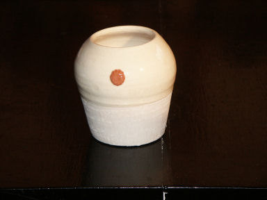 En lille hvid vase med røde knopper. Knopperne er lavet i en fedtstensform og presset på. Inspirationen til krukken kom fra noget keramik, jeg så på Bornholm. |