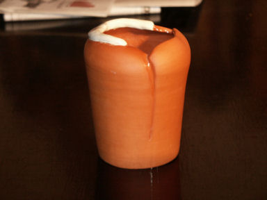 Endnu et penselbæger, eller hvad man nu skal kalde det. På dete bæger er udskæringen lavet kraftigere og der er lagt en mørk glasur som baggrund. |